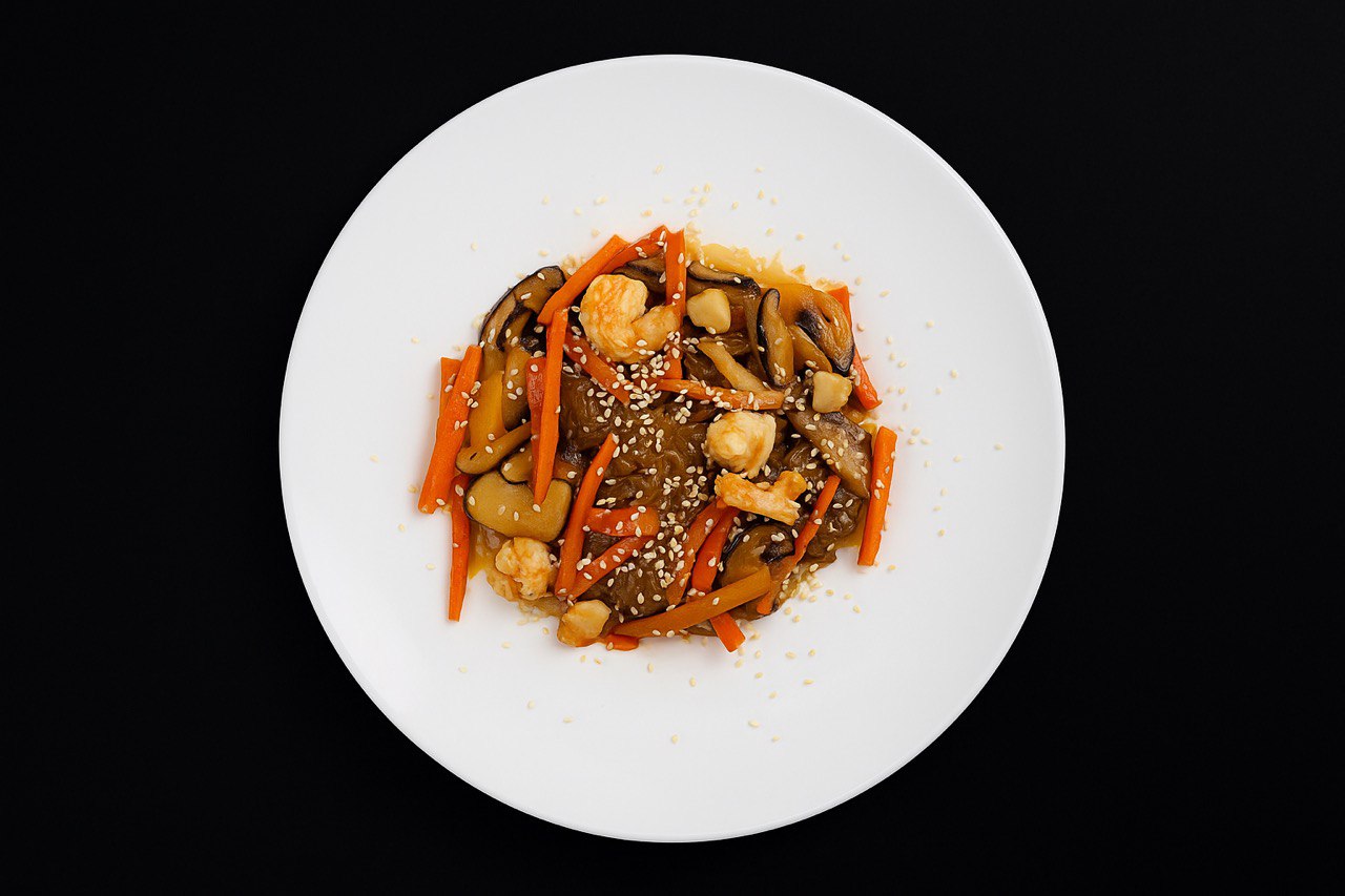 Склад: зелень гриби шиітаке, пекінська капуста, боби едамаме. Лапша фунчеза або удон. Соус на вибір: Устрічній, вершковий, кислосолодкий.